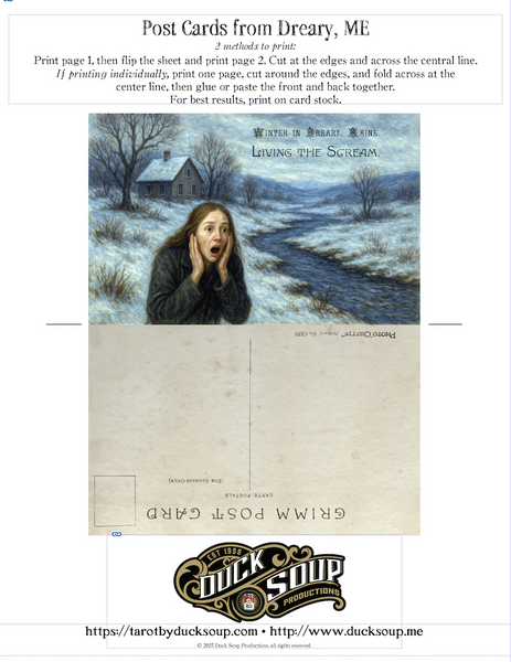 True Drearians despise the winter months, but realize that there's nothing to do but Survive them Somehow. Sometimes a good scream helps the most. In that spirit, we offer these OFFICIAL (tm) Winter Season "Living the Scream" post cards in two styles: Man and Woman. Download this set today, print and mail as many as you like, and Share Screams all around the globe!